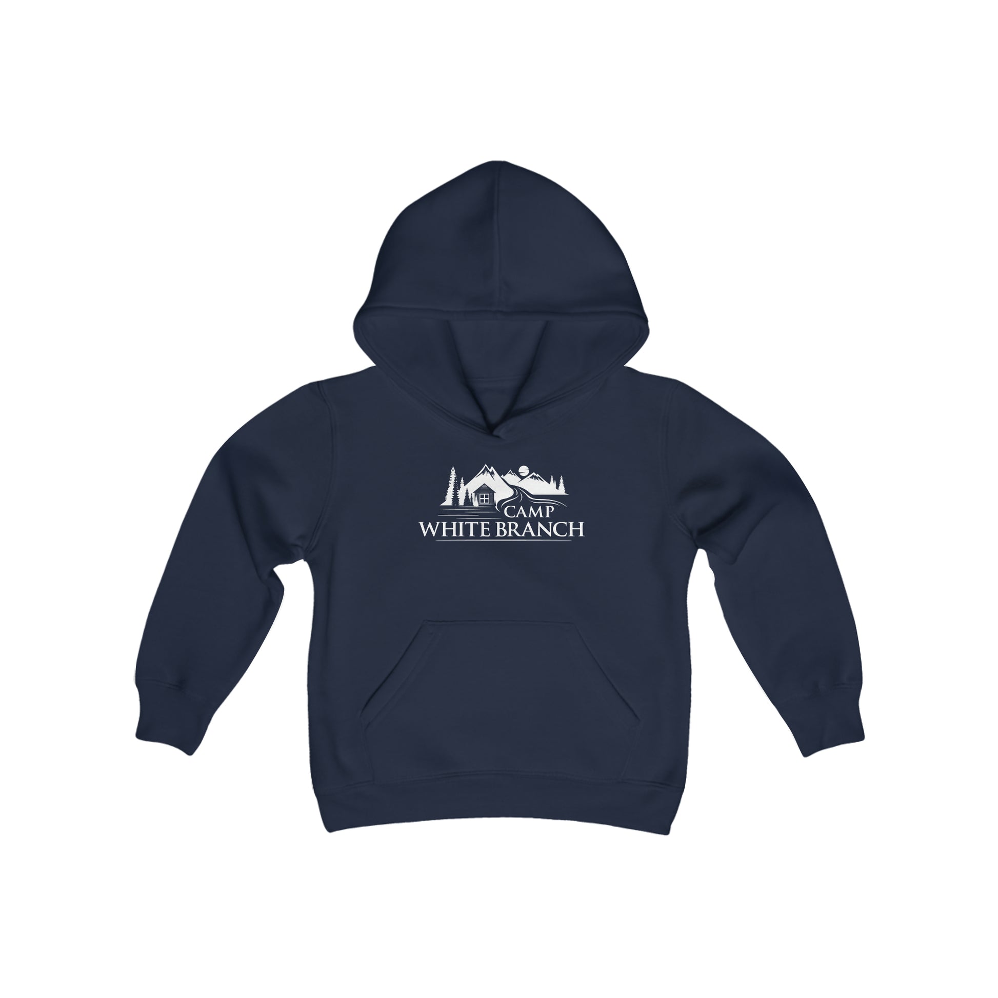 Camp White Branch printed in white on the front. The youth blend hooded sweatshirt is made of ultra-soft, preshrunk fleece that feels wonderful against the skin. The garment is 50% cotton 50% polyester with reduced lint buildup. The front has a kangaroo pocket big enough for both hands. The neck is reinforced with twill taping.